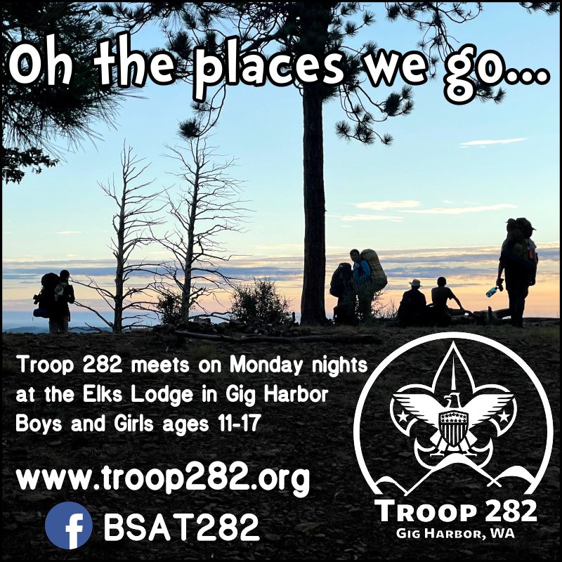Troop 282 has been teaching leadership to scouts in Gig Harbor for over 30 years. We are proudly charted by John Paul Jones Masonic Lodge #98. We meet every Monday night at the Elks Lodge in Gig Harbor at 7pm.